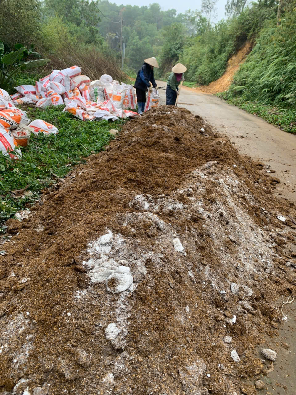 | 18-02-2025 12:02:00 | Thao tác kỹ thuật | Tiến hành ủ phân sử dụng tại khu 1. Nguyên liệu gồm 2.1 tấn phân gà được thu gom từ các hộ chăn nuôi xung quanh, 45kg vôi, 5kg chế phẩm men vi sinh ủ "Kiến vàng". Thực hiện trộn đều phân và vôi với nhau, sau đó cứ rải một lớp phân rồi lại rải một lớp chế phẩm vi sinh Kiến vàng. Tưới nước cho đống ủ sao cho độ ẩm đạt 50%. Dùng bạt, bao rứa để đậy kín để giữ nhiệt và độ ẩm. Sau khoảng 15 - 20 ngày tiến hành kiểm tra, đảo trộn nếu cần và nếu nguyên liệu khô thì bổ sung nước. Dự kiến thời gian ủ từ 45 – 60 ngày. | Hoàn thành | |